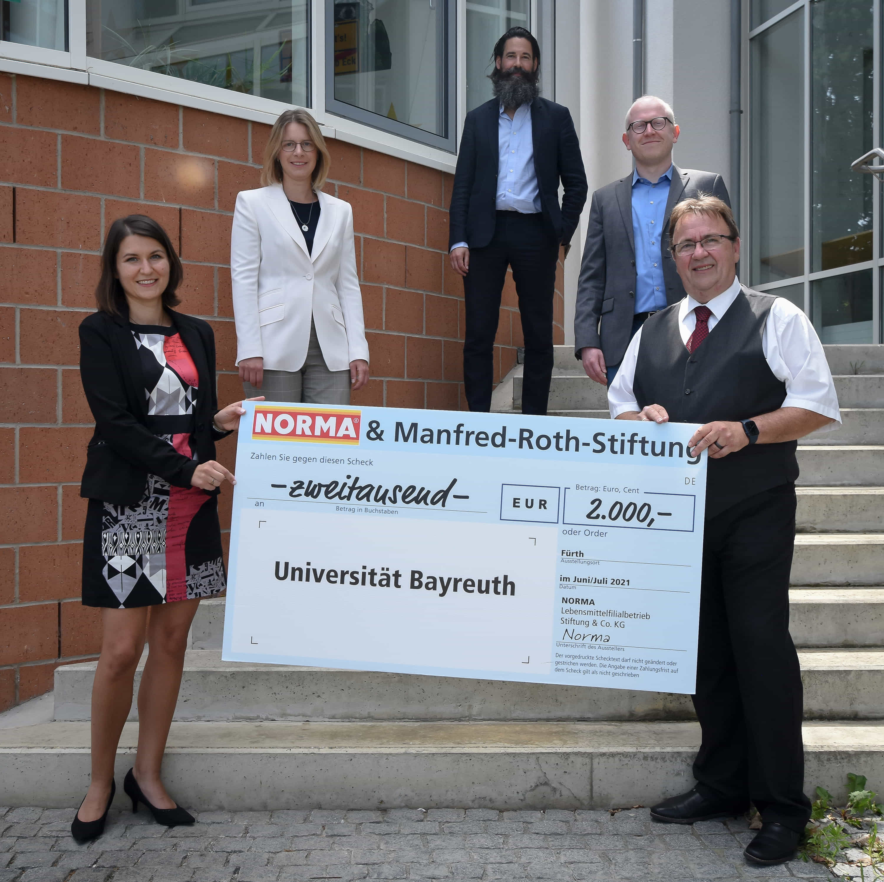 Gemeinsam mit Geflüchteten die Region stärken – das will die Manfred Roth Stiftung des NORMA-Gründers mit ihrer Spende von 2.000 Euro für die Universität Bayreuth erreichen. Die Summe soll in das Projekt fließen, das geflüchtete Akademikerinnen und Akademiker aus den mathematischen, technischen, natur- und ingenieurwissenschaftlichen Fächern (MINT) beim Einstieg in den deutschen Arbeitsmarkt unterstützt.